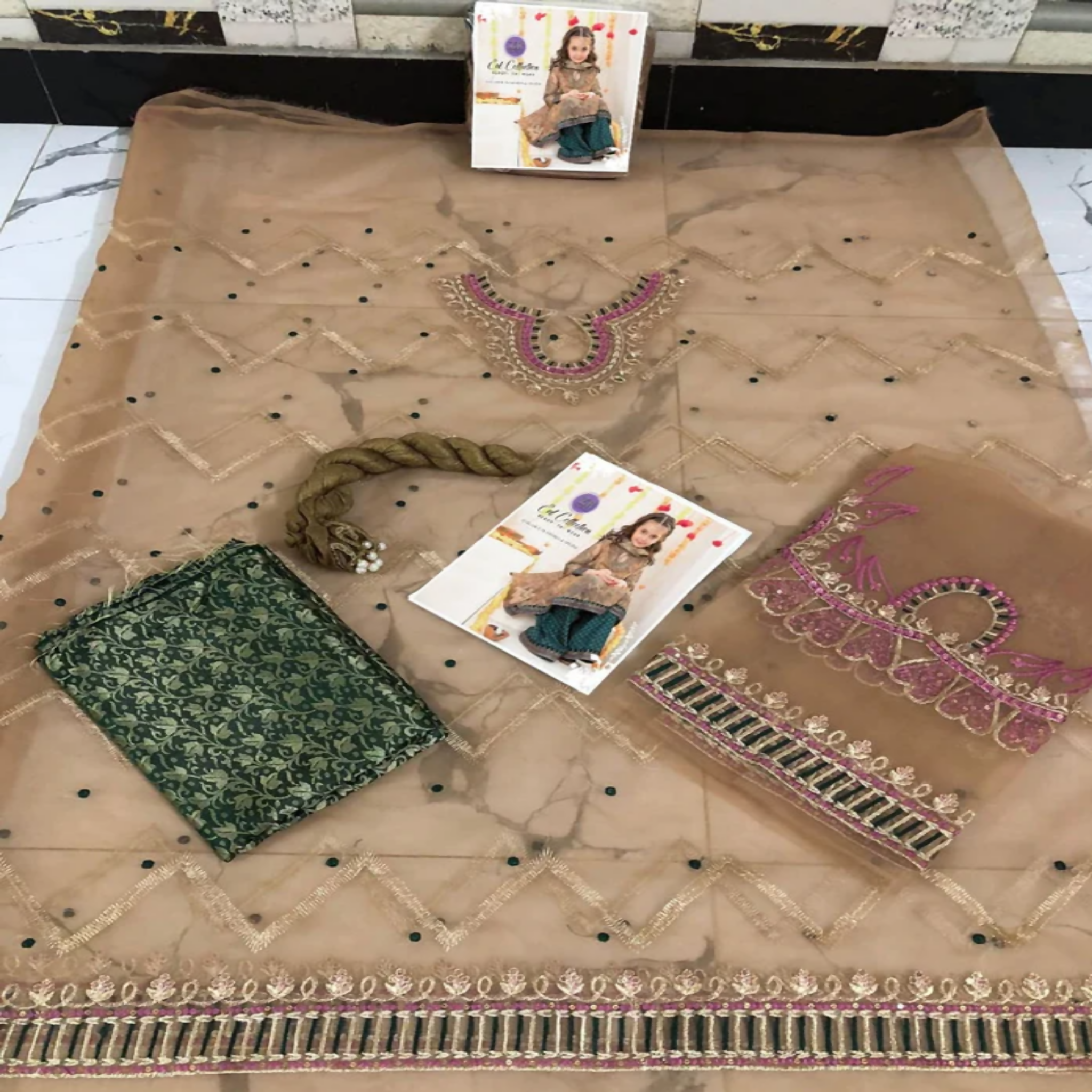 Elegant kids party wear featuring organza embroidery, chunn dupatta, and jamawar trousers. Suitable for ages 5 to 13.