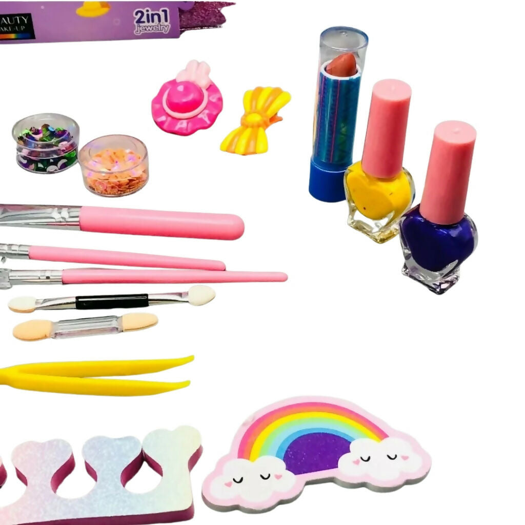 • 2-in-1 Play Set: Combines makeup and jewelry for a complete pretend play experience.