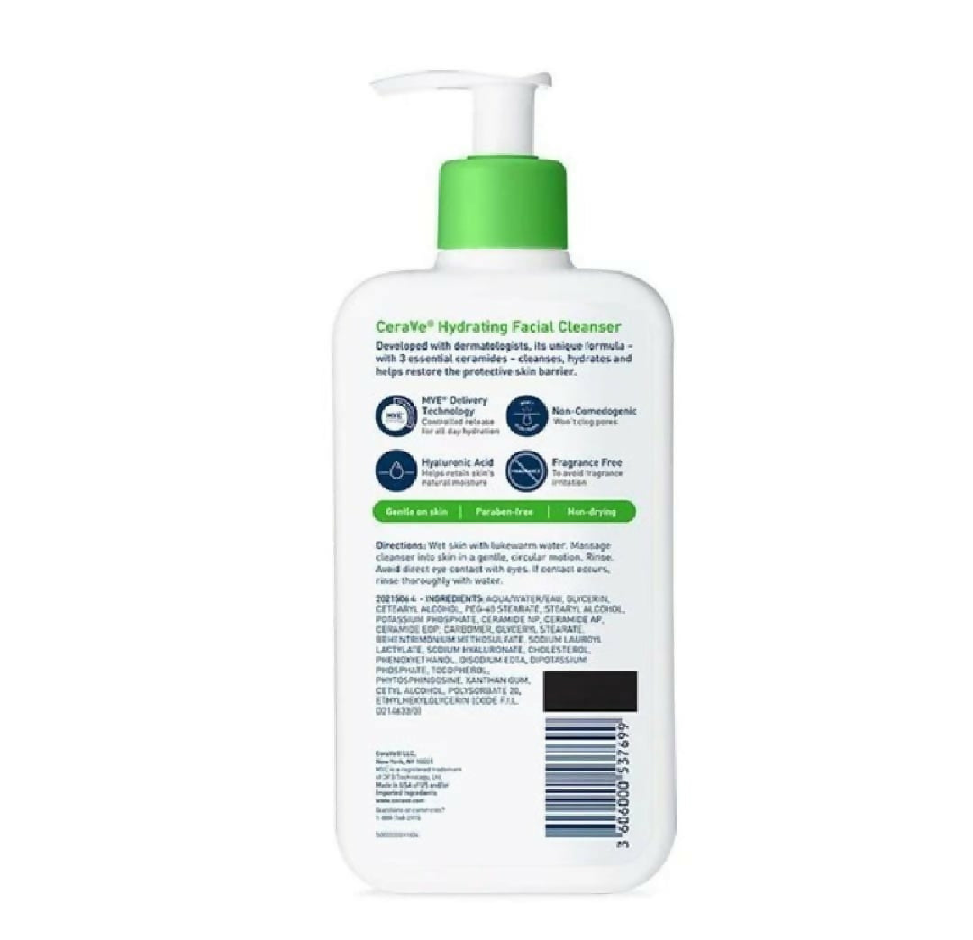Cerave Hydrating Facial Cleanser 237ml – Gentle, moisturizing face wash with Hyaluronic Acid and Ceramides for normal to dry skin. Developed with dermatologists, it removes dirt, oil, and makeup without stripping your skin’s natural moisture. Enriched with essential ceramides and hyaluronic acid, it helps restore the skin’s protective barrier and provides long-lasting hydration. The MVE technology ensures continuous moisture release throughout the day. Fragrance-free, non-comedogenic, and perfect for sensitive skin.