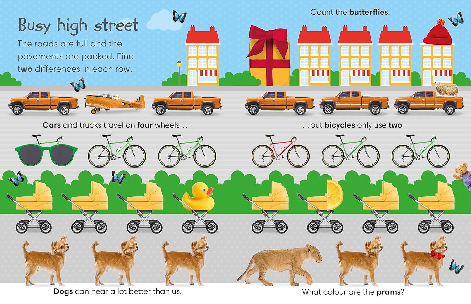 Will they find the shoe among the slides, or a crab in the sandpit? Whether comparing two pictures to find the differences, or looking for the odd one out in repeated patterns, young readers will develop observational skills, and they'll be having so much fun they won't even know they're learning!