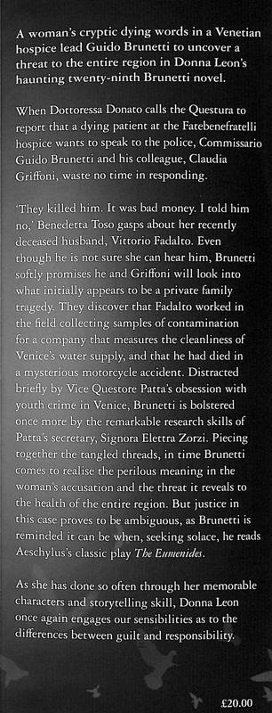 'They killed him. It was bad money. I told him no', Benedetta Toso gasps the words about her recently-deceased husband, Vittorio Fadalto. Even though he is not sure she can hear him Brunetti softly promises he and Griffoni will look into what initially appears to be a private family tragedy. They discover that Fadalto worked in the field collecting samples of contamination for a company that measures the cleanliness of Venice's water supply and that he had died in a mysterious motorcycle accident. Distracted briefly by Vice Questore Patta's obsession with youth crime in Venice, Brunetti is bolstered once more by the remarkable research skills of Patta's secretary, Signora Elettra Zorzi. Piecing together the tangled threads, in time Brunetti comes to realize the perilous meaning in the woman's accusation and the threat it reveals to the health of the entire region. But justice in this case proves to be ambiguous, as Brunetti is reminded it can be when, seeking solace, he reads Aeschylus's classic play The Eumenides.